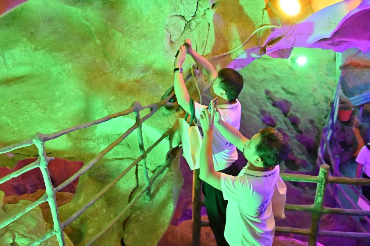 穿过狭窄的甬道,实践团经过洞内储水区。“这里居然还有天然形成的小水潭,水特别清澈。”新闻学院学生胡杨蹲在水边,用手掬起一捧水,“胡志明同志当年可能就喝这里的水吧,想想就觉得特别不容易。”