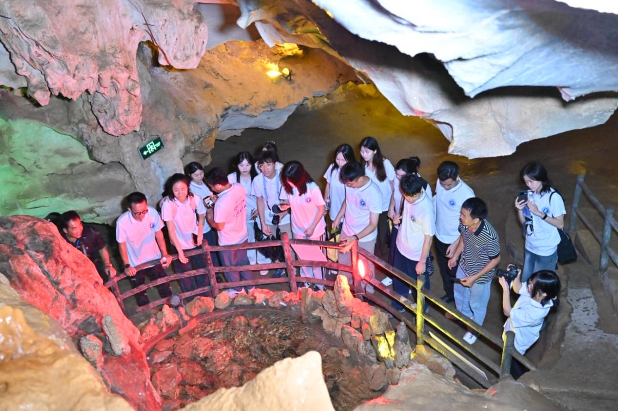 下午,实践团探访吞盘胡志明洞。抬头朝着洞内潮湿的一处岩壁看去,“结义兄弟一条心”七个炭笔大字苍劲有力,旁侧的一首七言诗更引发师生热议:“日出东方一点红,鹅眉凤眼似弯弓。满天星斗零丁吊,乌云盖月暗朦胧。”