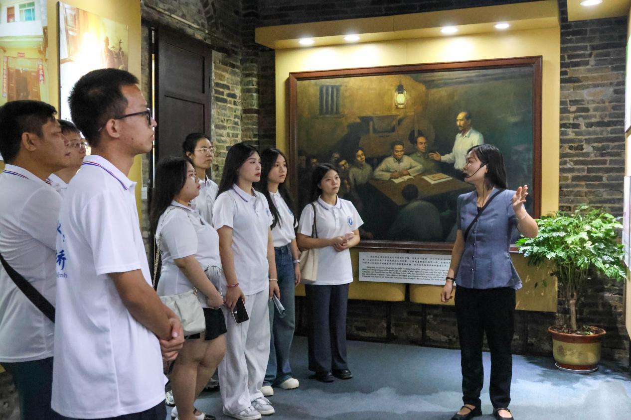随后,实践团前往越南革命者在龙州秘密机关旧址。这里曾是越南革命领袖胡志明等在华进行革命活动的重要秘密据点,见证了中越两国共产党人在共同的革命理想指引下,相互支持、并肩战斗的光辉历史。实践团成员们通过现场学习,深刻体会到在民族解放的道路上,中越两国人民始终是休戚与共的亲密战友。
