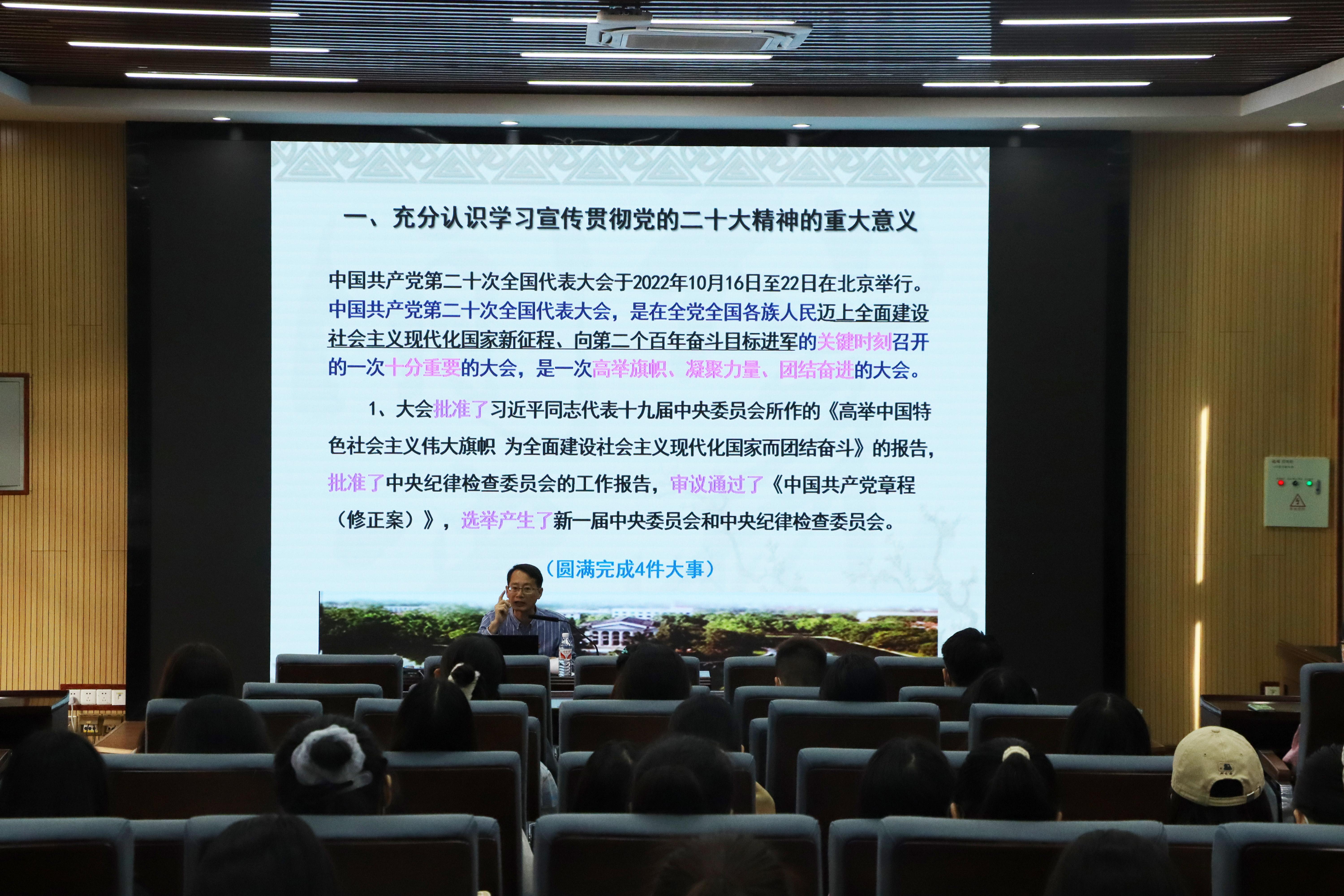 11月8日下午,ok138太阳集团古天乐党委在学院融通报告厅召开党的二十大精神宣讲会。宣讲会由学院党委书记黄开勇主讲,全体学生党员参加宣讲会。