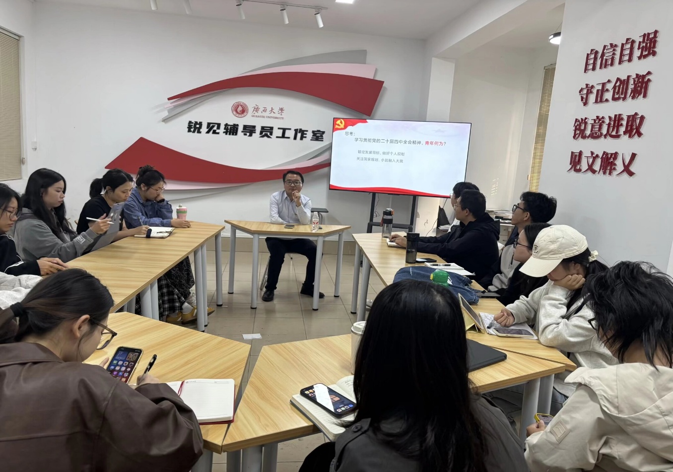 在现场学习讨论环节,党员们纷纷结合各自学业、就业等实际问题交流感悟,将党的二十届四中全会精神的学习落入党员个人的成长历程中,在思辨与共鸣中碰撞思想火花。